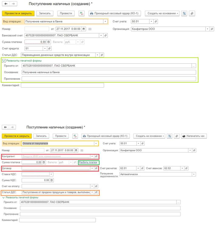 Рисунок 5. ПКО - наличные из банка. Показаны реквизиты печатной формы