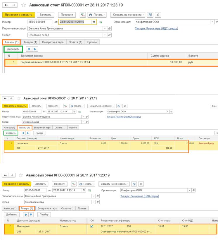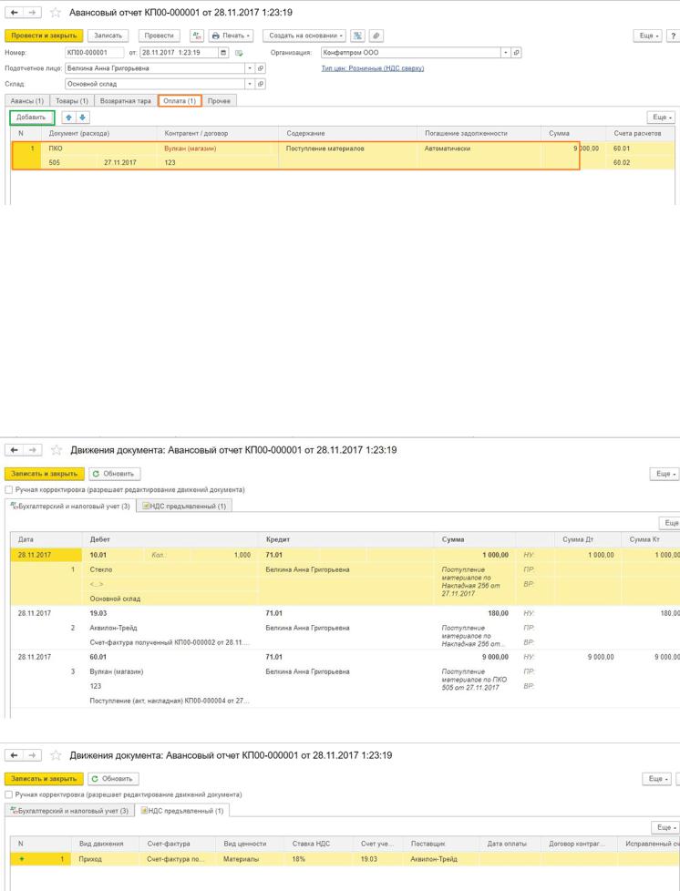 формирования акта сверки. Тогда накладные и счет-фактуры, полученные от этого поставщика в день покупки за наличный расчет, можно провести отдельно от авансового расчета документом Поступление (акты, накладные), а в авансовом отчете отразите реквизиты ПКО, т.е. документ оплаты на вкладке Оплата.