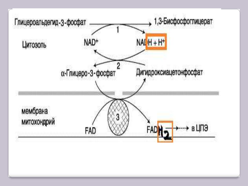 Известны 2 челночных механизма для переноса водорода. В первой из них водород от NADH в цитозоле передаѐтся на ДГАФ ферментом глицерол-3- фосфатдегидрогеназой (NAD-зависимой). Образованный в ходе этой реакции глицерол-3-фосфат (другое название – α-глицерофосфат), окисляется далее ферментом внутренней мембраны митохондрий – глицерол-3- фосфатдегидрогеназой (FAD-зависимой). Затем протоны и электроны с FADH2 переходят на убихинон, и далее по ЦПЭ.