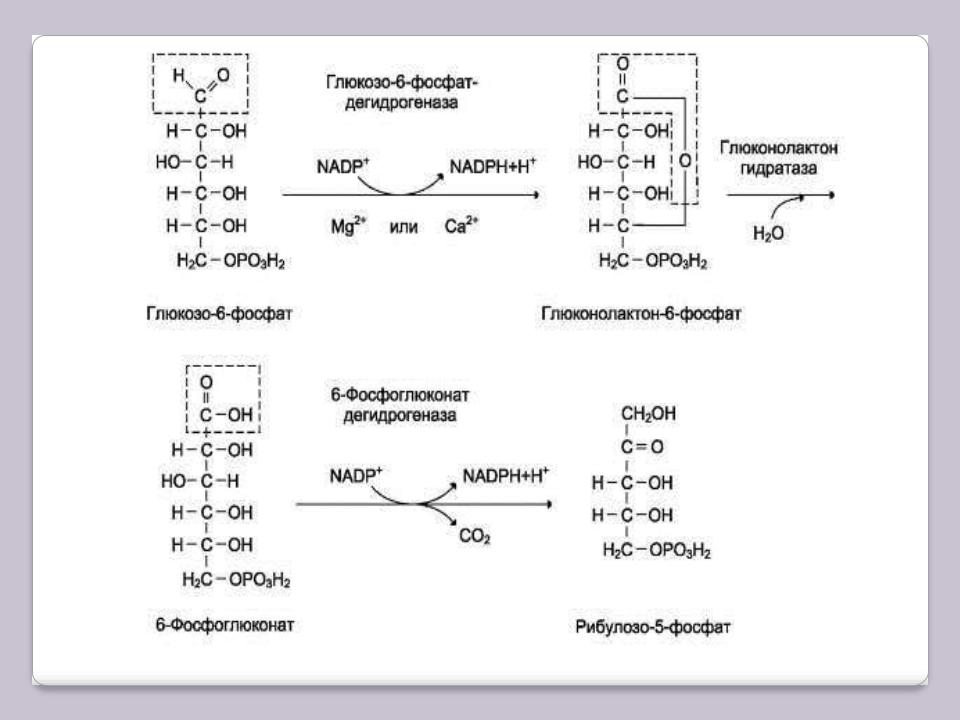 Глюкозо-6-фосфат + 2 NADP++ Н2О→Рибу-лозо-5-фосфат + 2(NADPH+Н+)+СО2.