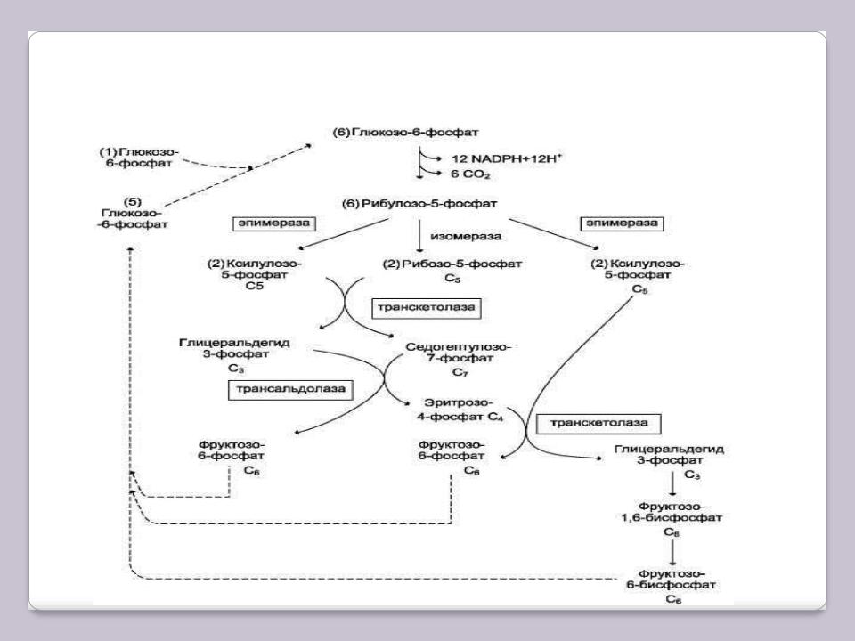 → 5 Глюкозо-6-фосфат+12 (NADPH+H+) + 6CO2.