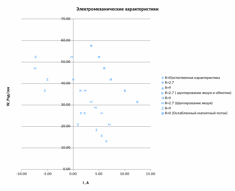 Выводы: Из графика электромеханических характеристик (рис.1) видно, что естественные и реостатные характеристики отличаются по форме от независимого возбуждения и невозможен переход в рекуперацию из-за возрастания оборотов при малых моментах. Следовательно, двигатели ПС используют там, где всегда есть достаточно большой момент на валу. Например, транспорт и эскалаторы
