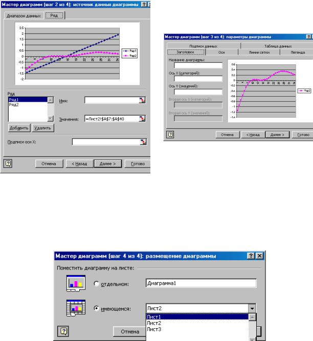 Для построения графика функции выделим ячейки А41:В56 и вызовем мастер построения диаграмм Вставка-Диаграмма. Далее выбираем вид диаграммы – Гладкие графики. Нажимаем кнопку «Далее». На закладке «Ряд» убираем аргумент из списка рядов, т.е. оставляем только функцию. В окно «Подписи оси X» вводим диапазон ячеек для аргумента «=a!$A$41:$A$56». Нажимаем кнопку «Далее». На закладке «Легенда» убираем птичку в окне «Добавить легенду». На закладке «Заголовки» вводим название графика – «График функции z», название оси х – «Х», название оси y – «Y». Нажимаем кнопку «Далее», затем – «Готово». После этого растягиваем область диаграммы до нужного размера