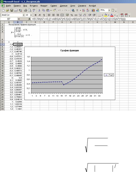 =ЕСЛИ(A41<0;КОРЕНЬ(1+A41^2*(1+A41^2));ЕСЛИ(И(A41>=0;A41<=1); 2*COS(A41)^2;КОРЕНЬ(1+ABS(2*SIN(3*A41))^(1/3))))