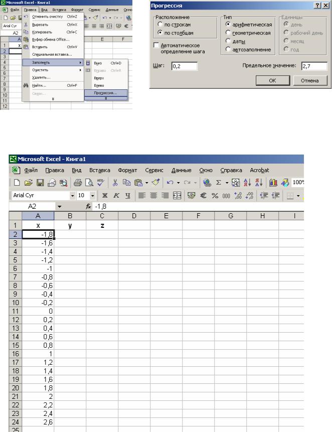 Зафиксируем курсор в ячейке А2 и выберем команду Правка Запольнить Прогрессия (рис.1.15). После ее выполнения появится диалоговое окно Прогрессия (рис. 1.16), которое заполним следующим образом:
