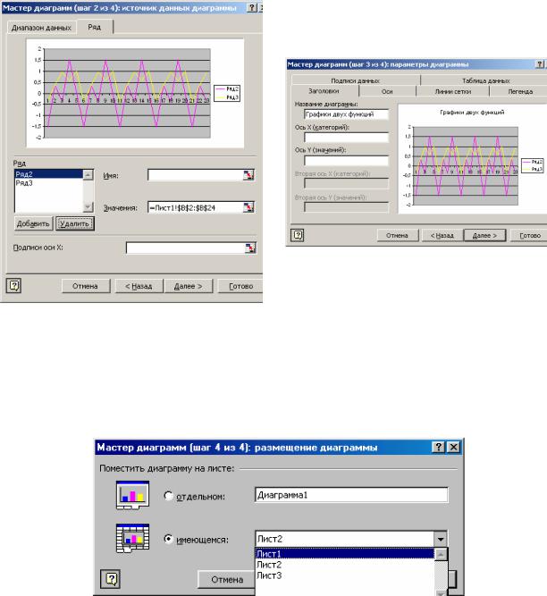 . Появится диалоговое окно Мастер диаграмм, в котором используя закладку Стандартные в Типе выберем График, а в Виде выберем график, который показан на рис. 1.19. Затем нажмем кнопку Далее, появится новое диалоговое окно (рис. 1.20). Перейдем на закладку Ряд и удалим в соответствующем поле Ряд 1 (рис. 1.21). Выполним следующий шаг 3, для чего снова нажмем кнопку Далее, появится новое диалоговое окно в котором в поле Название диаграммы запишем Графики двух функций (рис. 1.22), и нажмем кнопку Далее. В появившемся диалоговом окне в группе Имеющемся установим Лист 1 (рис. 1.23), что предполагает размещение на диаграмме на листе, на котором выполнялись все расчеты. Нажав кнопку Готово, получим на листе рабочей книги графики двух функций (рис. 1.24).