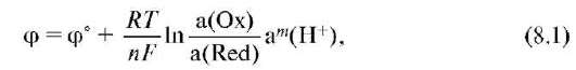 где а(Oх) и a(Red) - активность окисленной и восстановленной форм соответственно; R - универсальная газовая постоянная; Т - термодинамическая температура, К; F - постоянная Фарадея (96500 Кл/моль); n - число электронов, принимающих участие в элементарном редокс-процессе; а - активность ионов гидроксония; m - стехиометрический коэффициент перед ионом водорода в полуреакции. Величина φ° - стандартный редокс-потенциал, т.е. потенциал, измеренный при условиях а(Oх) = a(Red) = a(H+) = 1 и данной температуре.