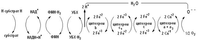 В результате биологического окисления (дегидрирования) два атома водорода (в виде двух протонов и двух электронов) от субстрата поступают в дыхательную цепь. Сначала происходит эстафетная передача протона и пары электронов молекуле НАД+, превращающейся в восстановленную форму НАДН+Н+, затем системе флавиновых оснований (ФАД/ФАД×Н2 или ФМН/ФМН×Н2), следующим акцептором двух протонов и двух электронов является убихинон (УБХ). Далее происходит передача только электронов: два электрона от УБХ×Н2 принимают на себя последовательно цитохромы в соответствии с величинами их редокс-потенциалов (табл. 5.1). Последний из компонентов – цитохромоксидаза переносит электроны непосредственно молекуле кислорода. Восстановленный кислород с двумя протонами, полученными от УБХ×Н2 образует молекулу воды.