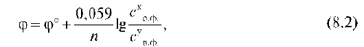 где φ°- стандартный окислительно-восстановительный потенциал пары, В; Со.ф. и Св.ф. - произведение равновесных концентраций окисленной и восстановленной форм соответственно; х и у - стехиометрические коэффициенты в уравнении полуреакций.