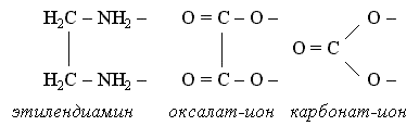Существует целый ряд лигандов, которые в комплексах являются практически всегда бидентатными. Это этилендиамин, карбонат-ион, оксалат-ион и т.п. Каждая молекула или ион бидентатного лиганда образует с комплексообразователем две химические связи в соответствии с особенностями своего строения: