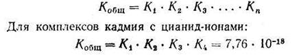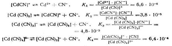 Если ионизация комплексных ионов происходит по ступеням, то константы равновесия этих промежуточных реакций называются промежуточными или ступенчатыми константами нестойкости. Например, для комплексов кадмия с цианид-ионами известны следующие промежуточные константы нестойкости, которые нумеруются в порядке возрастания числа лигандов, связанных с центральным атомом комплекса, ионизирующего на одну ступень: