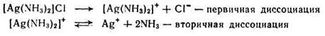 Лиганды, находящиеся по внутренней сфере, связаны с центральным атомом значительно прочнее и отщепляются лишь в небольшой степени. Обратимый распад внутренней сферы комплексного соединения носит название вторичной диссоциации (протекает по типу слабых электролитов). Например, диссоциацию комплекса [Ag(NH3)2]Cl имеет вид: