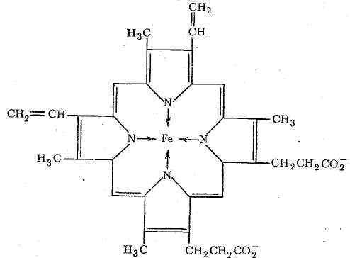 Таким образом, в координационную сферу иона железа входит пять атомов азота (четыре атома азота порфирина, один атом азота белкового гистидина). Шестое координационное место занимает О2.