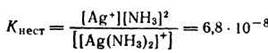 Диссоциация ионов [Ag(NH3)2]+, согласно приведенному выше уравнению, как и диссоциация всякого слабого электролита, подчиняется закону действия масс и может быть охарактеризована соответствующей константой равновесия, называемой константой нестойкости комплексного иона: