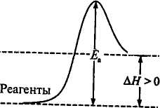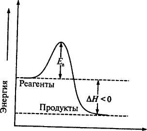 Энергетическая диаграмма экзотермической и эндотермической реакции представлена на рис. 2.3. Для любого химического процесса можно выделить начальное, промежуточное и конечное состояния. На вершине энергетического барьера реагенты находятся в промежуточном состоянии, которое называется активированным комплексом, или переходным состоянием. Разность между энергией активированного комплекса и начальной энергией реагентов равна Еа, а разность между энергией продуктов реакции и исходных веществ (реагентов) - ΔН, тепловому эффекту реакции. Энергия активации, в отличие от ΔН, всегда величина положительная. Для экзотермической реакции (рис. 2.3, а) продукты расположены на более низком энергетическом уровне, чем реагенты (Еа < ΔН).