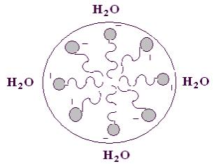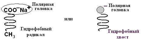 В воде могут находиться в диспергированном (раздробленном состоянии) вещества, содержащие в своём составе одновременно гидрофобные и гидрофильные группы. Такие соединения называют амфипатическими. Примерами могут служить калиевые и натриевые соли высших жирных кислот (ВЖК) – мыла. Ионизированная в воде карбоксильная группа ВЖК или её соли образует полярную головку, а углеводородный радикал – гидрофобный хвост (рис.3.3).