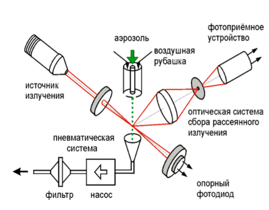 Частицы аэрозоля всасываются через штуцер отбора пробы в измерительную камеру через фокусирующее сопло, которое ориентировано так , чтобы воздушный поток проходил через лазерный луч, просвечивающий измерительную камеру. Благодаря количественной связи между размером частицы и интенсивностью рассеянного света, определяется размер частицы. Количество прошедших через луч частиц совпадает с числом световых импульсов рассеянного света.
