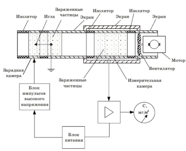 Аэрозольные частицы, содержащиеся в объеме воздуха, который прошел через зарядную камеру за время импульса коронного разряда, получают отрицательный заряд. В паузах между высоковольтными импульсами аэрозольные частицы не заряжаются. Таким образом, поток исследуемого аэрозоля оказывается промодулированным по плотности несомого им объемного заряда. Проходя через измерительную камеру, заряженные частицы пыли индуцируют на ее электроде ток, который создает напряжение на входном сопротивлении усилителя. Амплитуда напряжения пропорциональна общему заряду всех частиц, находящихся в объеме измерительной камеры. Переменное напряжение усиливается усилителем и измеряется стрелочным прибором, проградуированным в единицах массовой концентрации «мг/м 3». Заряд, полученный каждой аэрозольной частицей в зарядной камере, пропорционален ее поверхности. Поэтому прибор ИКП-5 позволяет измерять как поверхностную, так и, после соответствующей градуировки, массовую концентрацию дисперсной фазы аэрозоля