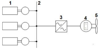 3 - полупроводниковый преобразователь частоты (ППЧ); 4 – синхронный гребной электродвигатель (ГЭД); 5 – гребной винт фиксированного шага