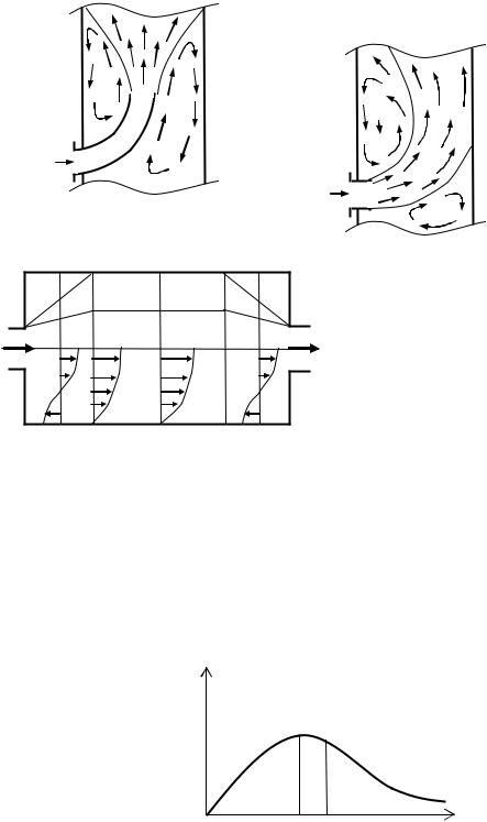 Наиболее корректной математической моделью структуры потоков в аппарате является исчерпывающее описание. Однако решение уравнений Навье – Стокса с условиями однозначности для большинства случаев невозможно. Поэтому на практике идут по пути упрощения модели, используя для характеристики структуры потока функцию распределения времени пребывания элементов потока в аппарате. Разумеется, f*( ) является далеко не полной характеристикой движения, хотя и достаточной для интегральной оценки работы аппарата.