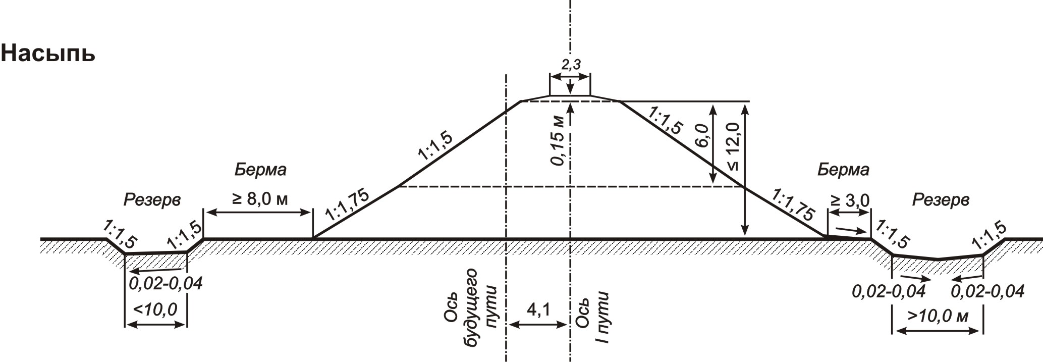 Для быстрого стока вод берму всегда планируют с уклоном 0,02-0,04 от тела земляного полотна шириной у подошвы откосов насыпи обычно 3 м (при высоте насыпи до 2 м допускается уменьшение ширины бермы до 1 м). Если насыпь построена под один путь, то со стороны будущего второго пути делают уширение на 4,1 м (стандартное междупутное расстояние). Ширина бермы у подошвы кавальеров обычно составляет 1–5 м; в районах со снежными заносами устраивают берму увеличенной ширины. |
