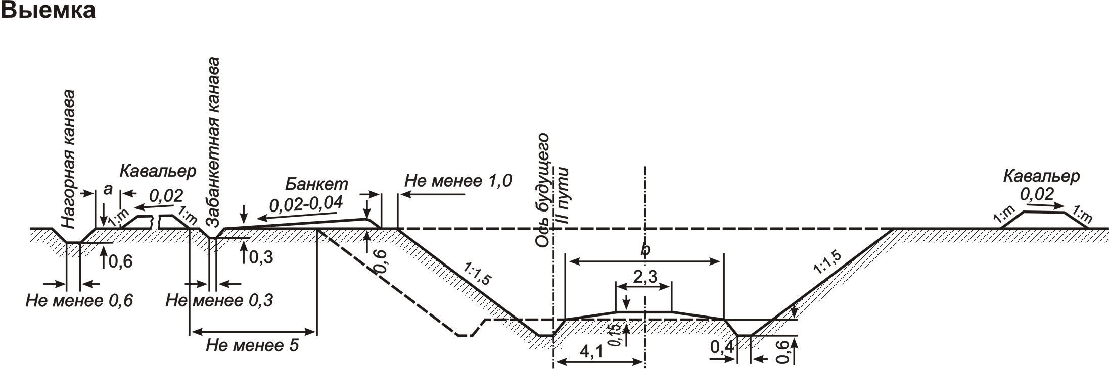 Справа и слева от выемки располагаются водоотводные сооружения: кавальеры, банкет, забанкетная и нагорная канавы.