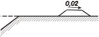 Бровка на насыпях при подходе к большим и средним мостам в пределах разлива вод, а также на насыпях вдоль рек и водохранилищ должна возвышаться над наивысшей отметкой наката волны с учетом подпора не менее чем на 0,5 м, бровка не затопляемых водой берм и регуляционных сооружений - не менее чем на 0,25 м. На подходах к малым мостам и трубам бровка находится выше наибольшего уровня высоких вод (с учетом подпора) не менее чем на 0,5 м. |