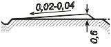 Ширина по дну 0,4 м и глубина 0,6 м. Крутизна откосов кюветов со стороны пути не более 1:1,5; полевые откосы имеют ту же крутизну, что и откосы выемки. Продольный уклон кювета обычно равен уклону пути, но не менее 0,002, а в районах с суровым климатом и избыточным увлажнением – не менее 0,003. Если путь в выемке расположен на площадке или имеет уклон менее 0,002, то кювет устраивают с уклоном 0,002 в обе стороны от водораздела, где его глубину уменьшают на 0,2 м. На выходе из выемок кюветы плавно отводят от земляного полотна в лога или путевые резервы. |