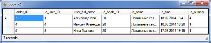 Скрипт для хранимой процедуры Order_Select приведен выше. Процедура Order_Select использует базовую таблицу Orders и связанные таблицы Users и Books. Три параметра процедуры – @order_ID, @user_ID и @book_ID обеспечивают широкие возможности по выборке данных.
