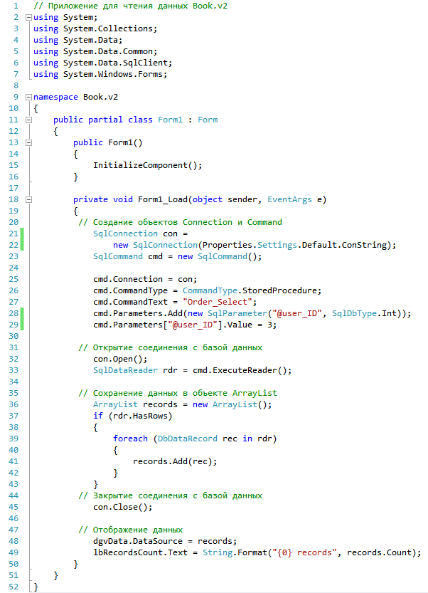 Для формы создадим обработчик события Load, в тело которого будем писать код, необходимый для чтения информации из базы данных.