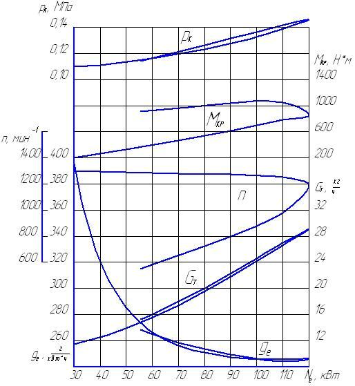 1) крутящим моментом, частотой вращения коленчатого вала, часовым удельным расходами в функции мощности (см. рис. 2):