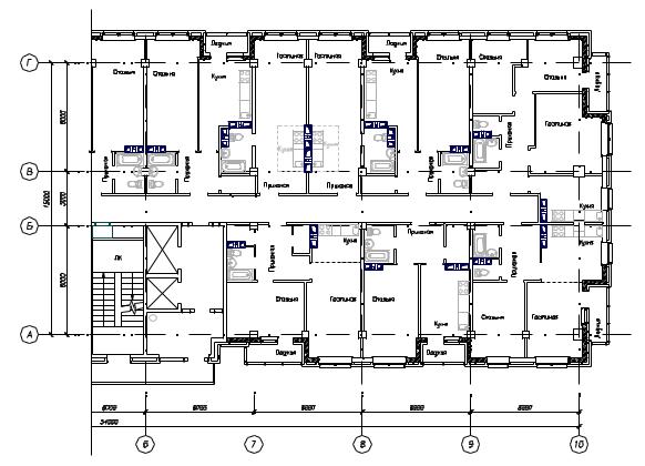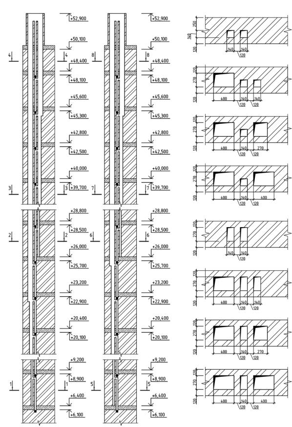 Вытяжные вентиляционные каналы – сборные, с зонированием по высоте. Сборные каналы 1-й зоны обслуживают квартиры 2-го – 8-го этажей, сборные каналы 2-й зоны обслуживают квартиры 9-го