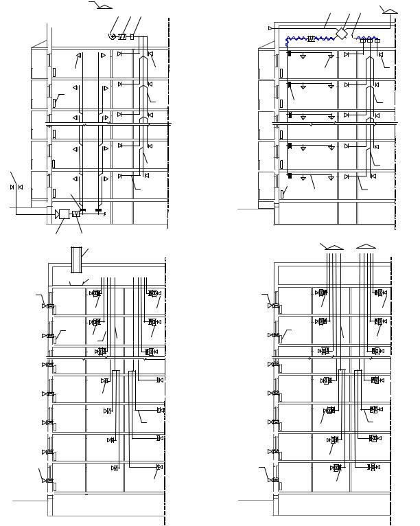 Рис.2.1. Схемы систем вентиляции жилых зданий с естественным побуждением движения воздуха: а, б – с холодным чердаком; в, г - с теплым чердаком: 1 – приточное вентиляционное устройство (оконный или стеновой вентиляционный клапан с регулируемым открыванием); 2 - вытяжная вентиляционная решетка; 3 - обратный клапан; 4 – вытяжной вентилятор (по расчету на верхних этажах); 5 – вертикальный вентиляционный канал; 6 – сборный вентиляционный канал; 7 – канал-спутник; 8 – горизонтальный вентиляционный канал (воздуховод); 9 - прибор системы отопления; 10 – дефлектор; 11 – вытяжная вентиляционная шахта; 12 - поддон