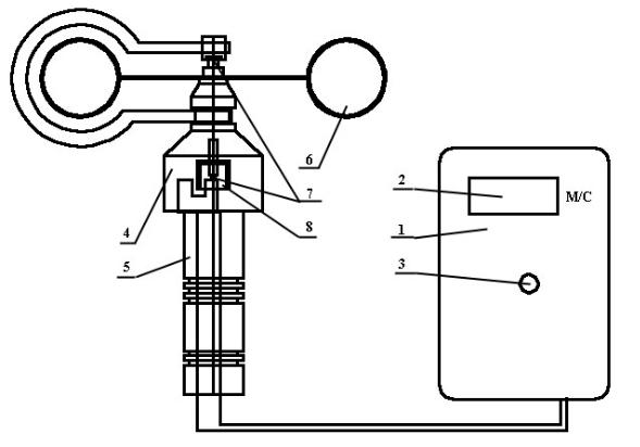 Рис. 12. Схема работы анемометра: 1- корпус пульта; 2- цифровой индикатор; 3- кнопка включения; 4- корпус датчика ветра; 5- ручка; 6- вертушка; 7- камень часовой; 8- обтюратор