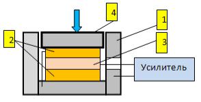 В момент приложения силы на нажимное устройство 4 пьезоэлектрические пластины сжимаются и генерируют напряжение, которое поступает на вход усилителя.