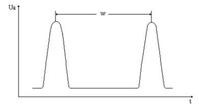 Изменение сопротивления с помощью схемы, показанной на рисунке 3.24, преобразуется в изменение напряжения Uа. Зависимость выходного напряжения сигнала от времени показана на рисунке 3.25.