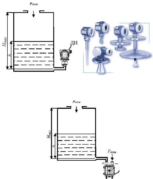 На рисунке 4.11 приведена схема измерения уровня датчиком избыточного давления (манометром). Для этих целей может применяться датчик любого типа с соответствующими пределами измерений.
