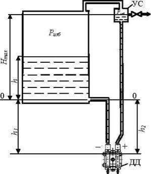 Такая измерительная схема может использоваться тогда, когда дифманометр расположен на одном уровне с нижней плоскостью резервуара. Если это условие соблюсти невозможно и дифманометр располагается ниже на высоту h1, то используют уравнительные сосуды (УС).