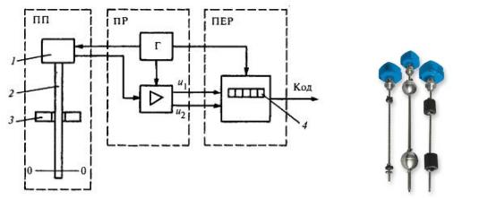 Ультразвуковой уровнемер состоит из преобразователей: первичного ПП, промежуточного ПР и передающего ПЕР. В состав первичного преобразователя входят источник ультразвуковых колебаний 7, погружаемый в контролируемую среду металлический стержень 2 и перемещающийся вдоль него поплавок 3. Источником формируется ультразвуковой импульс и снимаются со стержня сигналы, отраженные от поплавка и участка стержня, соответствующего нулевому уровню. Промежуточный преобразователь усиливает их и в виде двух импульсов напряжения U1, и U2 подает на передающий преобразователь. По моменту начала импульса, задаваемому генератором Г, и времени поступления импульсов вычисляется время прохождения импульса в стержне от поплавка до нулевой отметки (т. е. в пределах контролируемого уровня). Для учета температурного удлинения стержня по импульсу U2 вычисляется время t2 прохождения импульса по всему стержню. Значение контролируемого уровня определяется по формуле: