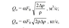 где Q0 — объемный расход; Qм — массовый расход; α — коэффициент расхода; F0 — площадь отверстия сужающего устройства.