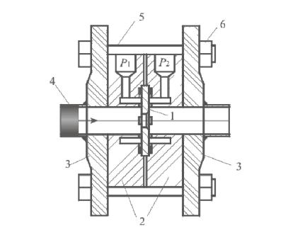 Диафрагмы. Нормальная диафрагма представляет собой тонкий металлический диск 1, имеющий круглое отверстие, расположенное концентрично оси трубы, с прямоугольной кромкой на стороне входа и со скосом на стороне выхода (при значительной толщине диска диафрагмы). Поток входит в цилиндрическую часть отверстия. Отбор давлений до и после диафрагмы осуществляется, как правило, при помощи кольцевых камер 2, как показано на рисунке 4.41. В этом случае сужающее устройство называется камерной диафрагмой. В трубопровод кольцевые камеры вместе с диафрагмой устанавливаются с использованием фланцев 3, соединенных при помощи болтов или шпилек 5 и гаек 6. Трубы 4 соединяются с фланцами при помощи сварки.