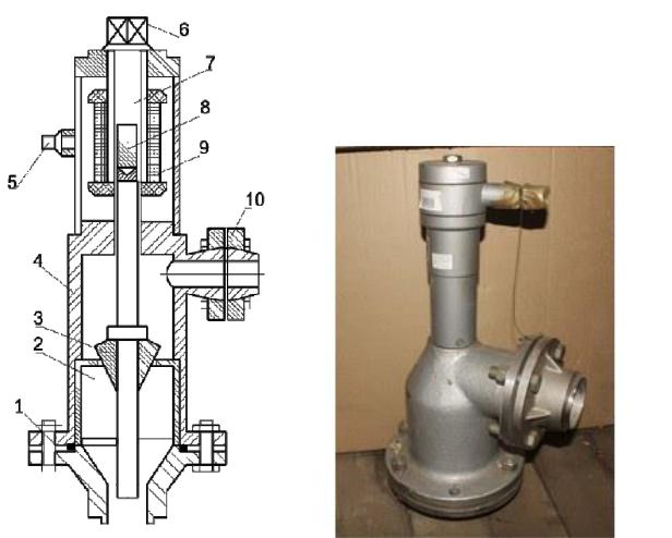1, 10 — входной и выходной штуцеры; 2 — дисковое седло; 3 — конический поплавок; 4 — корпус; 5 — штекерный разъем; 6 — винт установки нуля; 7 — разделительная трубка; 8 — плунжер; 9 — дифференциальнотрансформаторный преобразователь