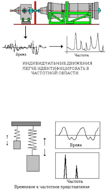Частотный анализ. Чтобы обойти ограничения анализа во временной области, обычно на практике применяют частотный, или спектральный, анализ вибрационного сигнала. Если временная реализация есть график во временной области, то спектр — это график в частотной области. Спектральный анализ эквивалентен преобразованию сигнала из временной области в частотную. Частота и время связаны друг с другом следующей зависимостью: