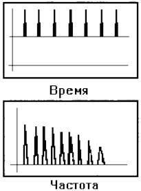 Если импульс, имеющий приведенный выше спектр, повторяется с постоянной частотой, то результирующий спектр, который показан здесь, будет уже не непрерывным, а состоящим из гармоник частоты повторения импульса, а его огибающая будет совпадать с формой спектра единичного импульса.