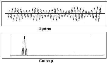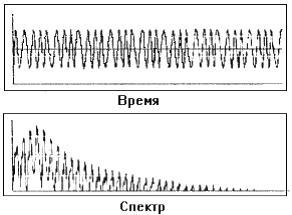 Модулируемая частота называется несущей. На представленном спектре максимальная по амплитуде компонента и есть несущая, а другие составляющие, которые похожи на гармоники, называют боковыми полосами. Последние располагаются симметрично по обеим сторонам от несущей с шагом, равным величине модулирующей частоты Частотная модуляция часто встречается в спектрах вибрации машин, особенно в зубчатых передачах, где частота зацепления зубьев модулируется оборотной частотой колеса. Она также имеет место в некоторых акустических динамиках, хотя и на очень низком уровне.