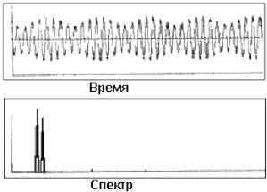 Этот пример биений аналогичен предыдущему, однако уровни складывающихся сигналов равны, поэтому они полностью взаимно уничтожаются в нулевых точках. Подобное полное взаимоуничтожение весьма редко встречается в реальных вибрационных сигналах роторного оборудования.