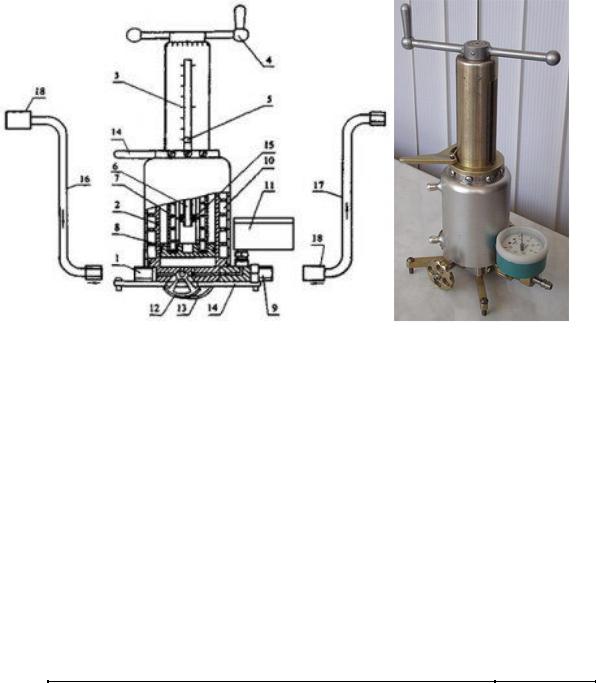 9 — выходной штуцер; 10 — термостатирующая рубашка; 11 — манометр; 12 — входной вентиль; 13 — выходной вентиль; 14 — установочные опоры; 15 — гайка; 16 — положение шланга высокого давления при отборе пробы; 17 — положение шланга высокого давления при измерении ДНП; 18 — фильтр