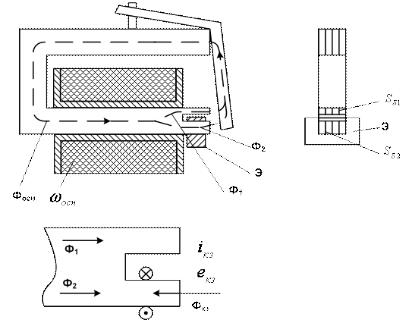 На рисунке 7.6 изображена схема реле переменного тока с короткозамкнутым витком. Конец сердечника, обращенный к якорю, расщеплен (пропилен) на две части, на одну из которых надета короткозамкнутая обмотка — экран Э (один или несколько витков).