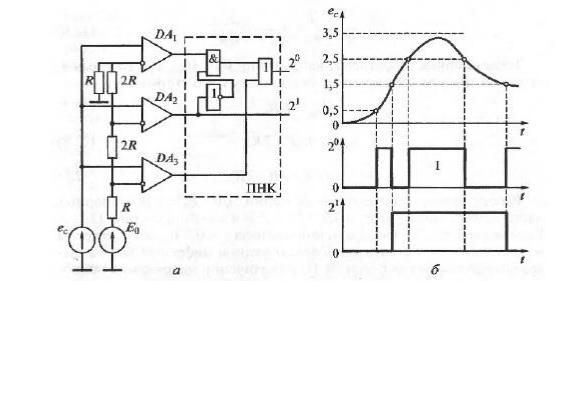 а — схема; б — процесс преобразования напряжения в код; DA1…DA3 — операционные усилители; ес — преобразуемый сигнал (напряжение); Е0 — источник постоянной ЭДС; R — резистор деления напряжения; ПНК — преобразователь напряжения в код