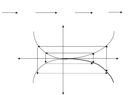 В первом квадранте строится статическая характеристика охватываемого звена I, во втором — характеристика звена обратной связи II. Результирующая характеристика III строится в первом квадранте.